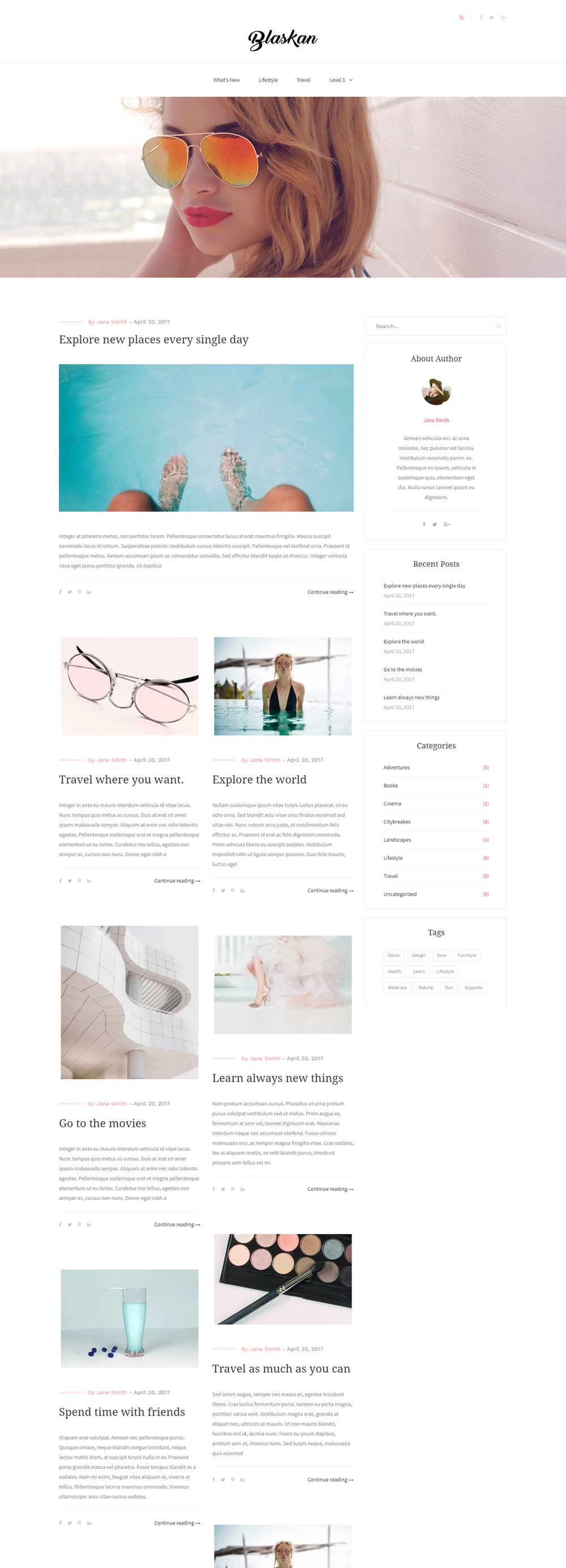 Blaskan is a responsive and accessible WordPress theme that's built for many kinds of screens. Blog, Custom Background, Custom Header, Editor Style, Featured Images, Grid Layout, Left Sidebar, Right Sidebar